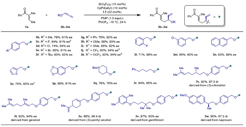 随后作者对底物进行了拓展,对于联烯底物,各类苄氧基取代的底物都能很好反应,而普通烷氧基取代的底物,对映选择性会略微下降。除此之外,很多天然产物衍生的联烯类底物,也能以很好的收率和对映选择性/非对映选择性得到产物。此外,反应也能实现克级规模的放大(图3)。
