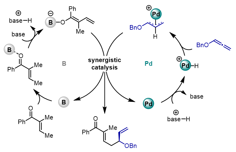 基于以往文献的研究,作者推测了可能的反应机理。催化循环启动于硼催化剂与羰基的配位,进而增强烯酮γ位酸性。随后碱对其去质子化,得到二烯醇式中间体和质子化的碱。后者进入钯循环,与钯催化剂反应得到钯氢物种,并进一步与联烯反应,生成烯丙基钯中间体。该中间体随后被二烯醇式中间体捕获,得到最终产物,并再生两种催化剂(图6)。