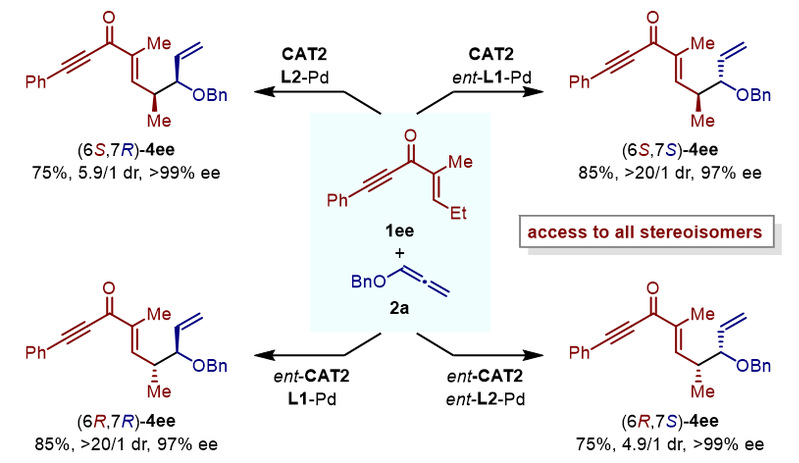 受此前过渡金属催化剂与有机催化剂或路易斯酸催化剂联用实现立体发散合成的启发,作者尝试结合手性螺环双硼催化剂与手性钯催化剂,探索立体发散合成。在烯酮1ee与联烯2a的反应中,手性螺环双硼催化剂可控制产物γ位手性,而手性金属钯催化剂可控制δ位手性,实现了立体发散合成(图5)。