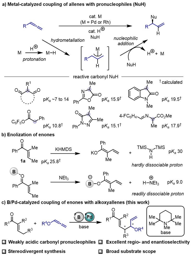 羰基化合物作为一类常用的前亲核试剂,其反应机制具有一定特殊性。因反应要求烯醇式亲核试剂与游离质子同时存在,使得反应仅适用于α 位酸性较强的羰基化合物(图1a)。截至目前,仅有两例报道使用了酸性较弱的羰基化合物:在镍催化下,酮或酰胺与 1,3-二烯发生偶联;该反应需使用叔丁醇钾等强碱。而在金属钯和铑催化的同类反应中,强碱夺取的质子难以对金属质子化,导致偶联反应无法进行。