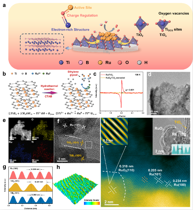 Figure 1. (a) Schematic illustration of microstructure for Ru/TiOx. (b) Brief schematic of the reaction process and the reaction equations. (c) EPR spectra of Ru/TiOx and RuO2/TiO2-annealed at 100 K. (d) TEM of Ru/TiOx. (e) Elemental mappings of O (yellow), Ru (blue) and Ti (red). (f) HR-TEM of Ru/TiOx. (g) Corresponding lattice stripe spacing. (h) 3D pseudo-color surface plot of TiOx extracted from the white box in Figure 1f. (i) AC-HRTEM of Ru cluster on Ru/TiOx. The inset on the left shows the image obtained by further processing the lattice fringes of RuO2 after applying fast Fourier transform (FFT) and inverse FFT. The inset on the right shows the HR-TEM image of the localized structure at the coupled interface between Ru clusters and the TiOx layer