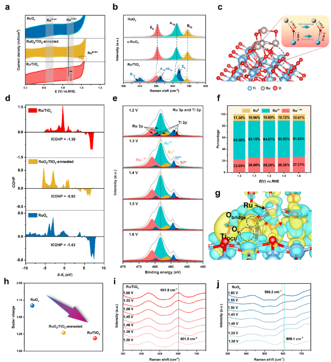 Figure 2. (a) CV curves of Ru/TiOx, RuOx and RuO2/TiO2-annealed. (b) Raman spectra of Ru/TiOx, RuOx and commercial RuO2. (c) Theoretical model of Ru-O clusters adsorbed on the TiOx surface. The inset shows the bond length variations between the TiOCU and Ru. (d) COHP calculations of Ru/TiOx, RuOx and RuO2/TiO2-annealed. (e) Quasi in-situ XPS spectra of Ru/TiOx. (f) Proportion of Ru valence states (Ru0/Ru4+/Ru>4+) calculated based on fitting results. (g) Deformation charge density of the Ru/TiOx. Specifically, the yellow and cyan regions represent electron accumulation and depletion, respectively. (h) Bader charge analysis of Ru atom for Ru/TiOx, RuOx and RuO2/TiO2-annealed. In-situ Raman spectra recorded from 1.30 to 1.60 V for (i) Ru/TiOx and (j) RuOx.