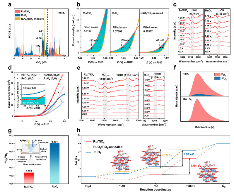 Figure 3 (a) The PDOS of orbital of Ru/TiOx, RuOx and RuO2/TiO2-annealed. (b) LSV curves for Ru/TiOx, RuOx and RuO2/TiO2-annealed. Specifically, the yellow line represents the test in 0.5 M H2SO4, the red line shows the result after the addition of 1.0 M methanol, and the green area represents the filled area. (c) In-situ ATR-FTIR spectra of Ru/TiOx and RuOx at different potentials. (d) LSV curves of Ru/TiOx and RuOx in H2O and D2O, respectively. The inset shows the corresponding KIE data in the potential range from 1.35 to 1.42 V vs. RHE. (e) Corresponding in-situ ATR-FTIR spectra in the low-wavenumber range. (f) DEMS measurements of 32O2 and 34O2 signals from the products for Ru/TiOx and RuOx in H216O/0.5 M H2SO4. (g) Corresponding ratio of 34O2/32O2 based on the filled area. The inset is a schematic diagram of the DEMS setup. (h) Gibbs free energy diagram of OER on Ru/TiOx, RuO2 and RuO2/TiO2-annealed.