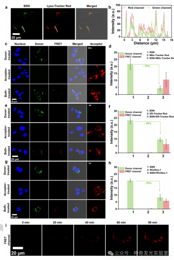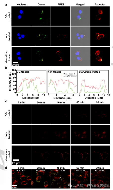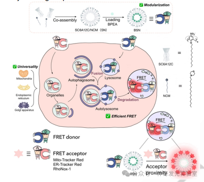 总结:本研究介绍了一种利用基于大环两亲性的FRET平台来成像细胞器自噬的新策略。这种方法依赖于在杯芳烃的内层疏水区域内捕获供体和杯芳烃腔内受体的络合。利用杯芳烃的广谱封装,使用三种商品化的细胞器染料作为FRET受体,成功地实现了三种关键细胞器Mito,ER和GA的自噬成像。通过复杂的主-客络合机制,促进了供体和受体分子的接近,从而导致FRET信号的有效激活。这种FRET过程使细胞器与溶酶体融合的可视化,提供了细胞器自噬水平的精确表征。这项研究强调了这种大环两亲性FRET平台的通用性和便利性,是细胞器自噬成像的有价值的工具。