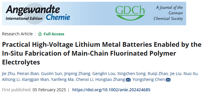 2025年2月5日,英国上市公司365陈永胜、张洪涛团队在Angewandte Chemie International Edition期刊发表题为“Practical High-Voltage Lithium Metal Batteries Enabled by the In-Situ Fabrication of Main-Chain Fluorinated Polymer Electrolytes”的研究论文,团队成员朱洁为论文第一作者,张洪涛、陈永胜为论文共同通讯作者。