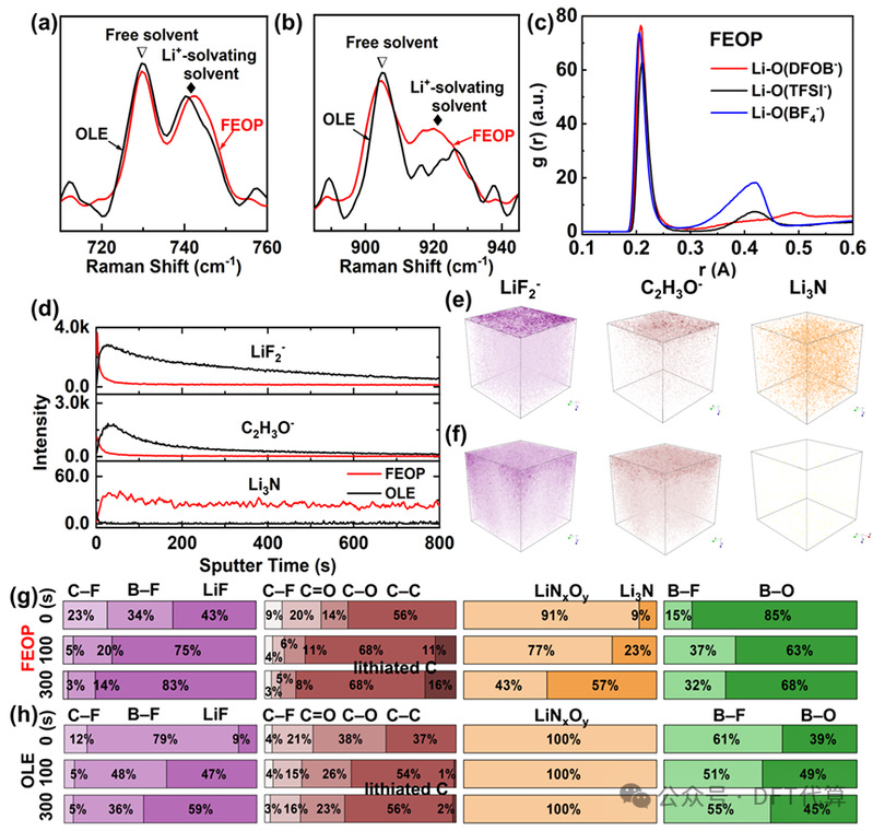 图2. (a-b)FEOP和OLE的拉曼光谱。(c)通过分子动力学MD模拟获得的FEOP的径向分布函数。(d)FEOP和OLE中SEI选定二次离子碎片的飞行时间二次离子质谱(TOF-SIMS)深度剖析。(e)FEOP和(f)OLE中SEI的LiF-、C₂H₃O-和Li₃N碎片的TOF-SIMS三维空间分布。(g)FEOP和(h)OLE中通过XPS)析获得的不同溅射时间下SEI的相对组成。