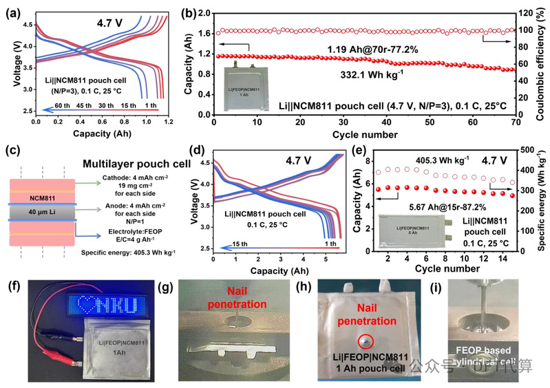 图6. (a)1 Ah固态LMB在4.7 V、0.1 C倍率下的充放电曲线。(b)1 Ah固态LMB在4.7 V、0.1 C倍率下的循环性能。(c)5 Ah固态LMB的结构。(d)5 Ah固态LMB在4.7 V、0.1 C倍率下的充放电曲线。(e)5 Ah固态锂金属电池在4.7 V、0.1 C倍率下的循环性能。(f)1 Ah固态LMB点亮灯板的照片。(g-h)使用FEOP的1 Ah固态LMB的针刺测试。(i)使用FEOP的固态18650圆柱形电池的针刺测试。
