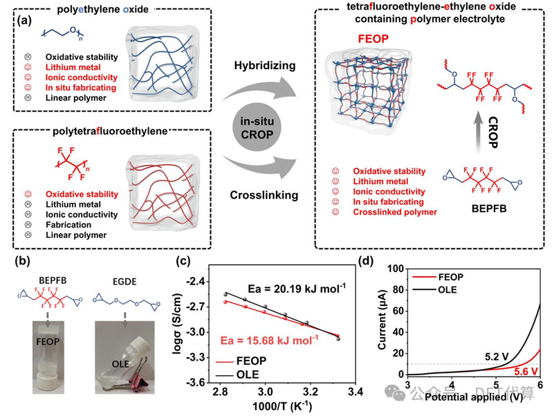 图1. (a)FEOP设计的示意图。(b)分别以BEPFB和EGDE为交联剂,将前驱体溶液在60 ℃加热24小时后,固化的FEOP和未固化的OLE的照片。(c)FEOP和OLE的离子电导率随温度的变化,数据采用阿伦尼乌斯传输模型拟合以计算活化能。(d)FEOP和OLE的LSV曲线。