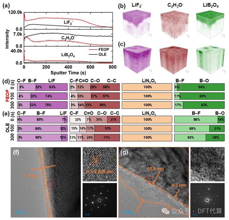 图4. (a)FEOP和OLE中CEI几种二次离子碎片的TOF-SIMS深度剖析。(b)FEOP和(c)OLE中CEI的LiF-、C₂H₃O-和LiB₂O₄碎片的TOF-SIMS三维空间分布。(d)FEOP和(e)OLE中通过XPS分析获得的不同溅射时间下CEI的相对组成。在1C倍率下循环50次后,从使用(f)FEOP和(g)OLE的Li||NCM811电池中取出的NCM811阴极的TEM图像和衍射图。