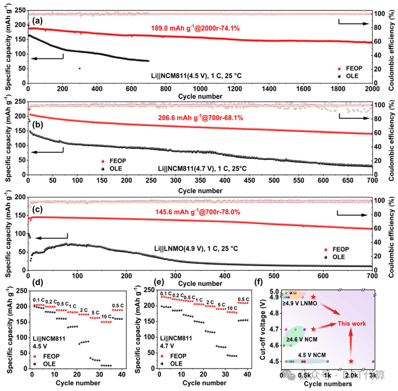 图3. 使用FEOP和OLE电解质的Li||NCM811电池在1C倍率下,充电截止电压为(a)4.5 V和(b)4.7 V时的循环性能。(c)使用FEOP和OLE电解质的Li||LNMO电池在1C倍率下,充电截止电压为4.9 V时的循环性能。使用FEOP和OLE电解质的Li||NCM811电池在充电截止电压为(d)4.5 V和(e)4.7 V时的倍率性能。(f)该研究中的Li||NCM811电池与近期报道的聚合物电解质在室温下,从循环次数和比容量方面进行的对比。
