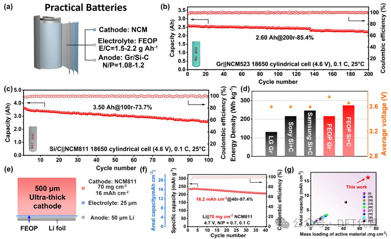 图5. (a)用于实际应用的1.9 Ah和3.3 Ah固态18650圆柱形LIBs的结构。(b)1.9 Ah固态18650圆柱形LIB(阳极:石墨)在4.6 V、0.1 C倍率下的循环性能。(c)3.3 Ah固态18650圆柱形LIB(阳极:硅+碳)在4.6 V、0.1 C倍率下的循环性能。(d)商业圆柱形LIBs与使用FEOP的圆柱形LIBs在能量密度和充电电压方面的对比。(e)超高质量负载Li|FEOP|NCM811全电池的结构。(f)具有70 mg cm⁻²阴极和50 μm Li的超高质量负载Li|FEOP|NCM811全电池的循环性能。(g)该研究中Li||NCM811全电池与近期报道的基于聚合物电解质的电池在活性材料的面容量和质量负载方面的对比。