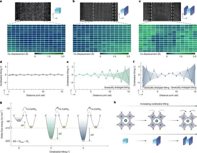 金属卤化物钙钛矿的软晶格结构使得八面体倾斜成为可能,这种无机八面体的刚性旋转显著影响了钙钛矿的光电性能和相稳定性。理论研究表明,控制八面体倾斜度可以调节钙钛矿相变的能垒。