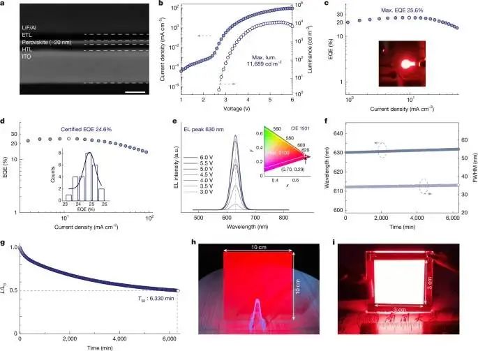 该方法还与大面积制造兼容,使1cm2的PeLED在630nm时表现出最佳的外部量子效率20.5%。