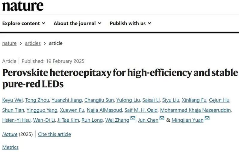 Wei, K., Zhou, T., Jiang, Y. et al. Perovskite heteroepitaxy for high-efficiency and stable pure-red LEDs. Nature(2025). https://doi.org/10.1038/s41586-024-08503-9
