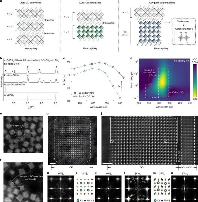 本文旨在通过利用由此产生的八面体倾斜,稳定超小CsPbI3量子点固体,构建纳米尺度的CsPbI3量子点/准二维钙钛矿异质外延(见图1a)。