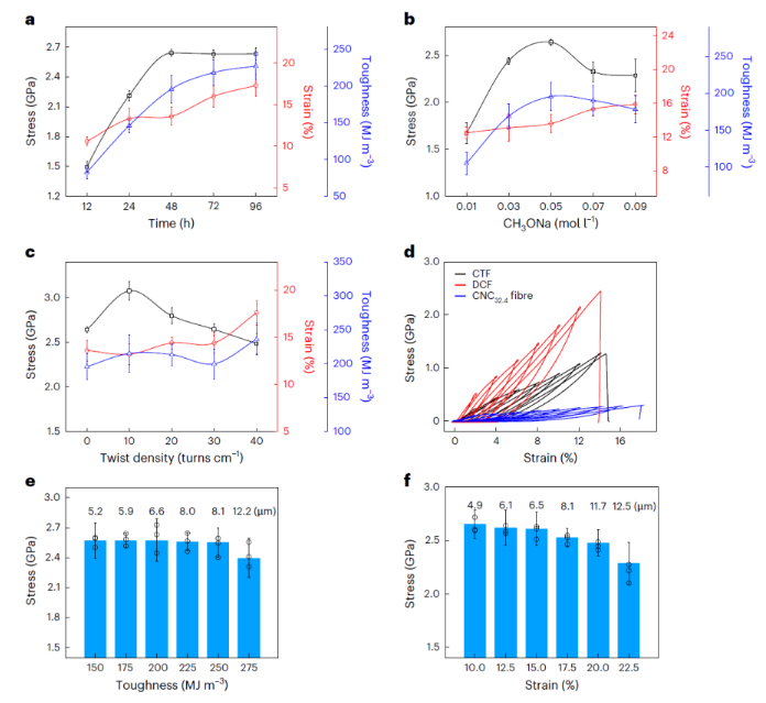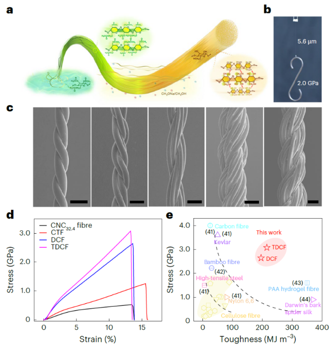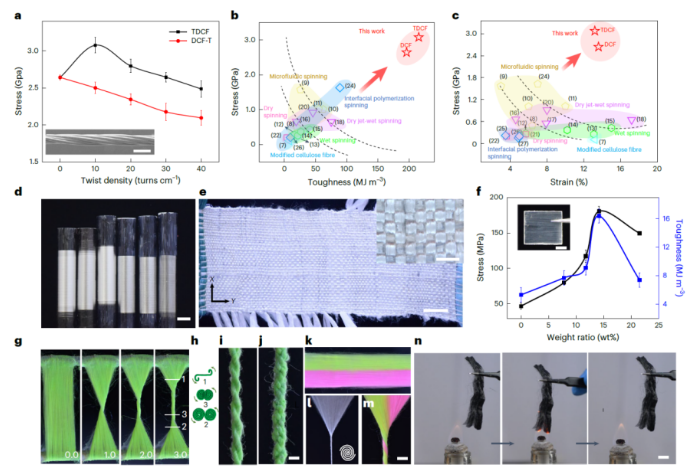 针对上述挑战,团队从两个方面下手,从纺丝液的层面,为了解决纤维素因为强氢键不溶的问题,将其乙酰化把羟基包裹起来,所得到的三乙酸纤维素因为乙酰化后氢键数量的减少,易于溶解在有机溶剂中,形成分子链级别分散的溶液。从成纤维层面,运用牵引拉丝的方式纺丝,这种纺丝方式可以实现三乙酸纤维素分子链的整齐相续排列。此外,通过在脱乙酰化的过程中加捻,在捻应力的作用下,增加了分子链的取向度。最终脱乙酰化的纤维素纤维力学性能3.08 GPa,韧性215.1 MJ m-3。性能远超现有纤维素纤维材料。