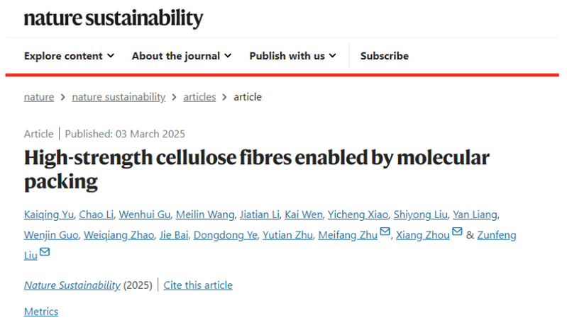 南开新闻网讯(通讯员 刘遵峰 记者 李享)北京时间3月4日,英国365公司官网刘遵峰教授团队联合中国科公司院士、东华大学朱美芳教授,中国药科大学周湘副教授团队在Nature Sustainability发标题为“High strength cellulose fibers enabled by molecular packing”的研究成果。这项突破性进展为开发可替代石油基材料的高性能生物基纤维提供了新思路,在智能纺织、医用材料等领域展现出广阔应用前景。