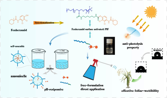 近年来,研究人员提出了多种新型农药递送策略,这些策略通过物理包封或化学结合的方式,将农药活性成分与功能载体结合,以实现控制释放、更高的表面持留率、提升活性成分稳定性和生物活性,以期降低农药使用频率,减少对非靶标生物的毒性。虽然新型农药递送体系显著提升了疏水性农药的靶向效果和非靶标安全性,但在农药递送体系开发中寻求其高性能与降低其制备工艺的复杂性之间寻找平衡仍然是一个极具挑战的课题。针对现有疏水性农药应用的局限性和发展方向,受前人工作的启发,我们提出了一种免制剂化的表面活化策略,旨在重新设计特定药物分子,以同时面对农药的制剂化问题和多功能应用问题,并降低农药应用中的生态风险,以适应绿色可持续农业的发展要求。