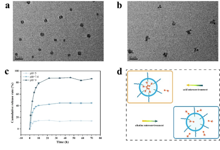 与游离形式的药物或传统药物制剂相比,纳米粒子具有独特的物理化学性质,对生物活性具有协同作用。PIF胶束的平均尺寸为114.7nm(PIF 1g/L、pH=5)。如图4c所示,通过透射电子显微镜(TEM)成像,我们观察到了负载了fenhexamid的纳米胶束的形态。胶束呈规则的球形,平均粒径约为110nm,与DLS结果一致。