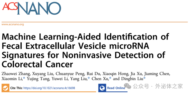 Machine Learning-Aided Identification of Fecal Extracellular Vesicle microRNA Signatures for Noninvasive Detection of Colorectal Cancer. ACS Nano 2025. DOI: 10.1021/acsnano.4c16698.