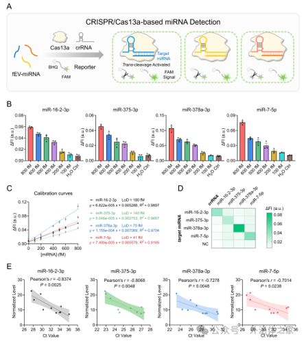 为了更加简便地在大规模临床队列中进行miRNA检测,作者建立了基于CRISPR/Cas13a的miRNA检测体系。当crRNA识别到靶标miRNA后,会激活Cas13a的反式切割活性,从而切割报告探针,释放荧光信号。针对4条miRNA标志物设计crRNA,考察工作曲线、检测特异性并与金标准RT-qPCR进行对比,验证了检测方法的可靠性。(图4)