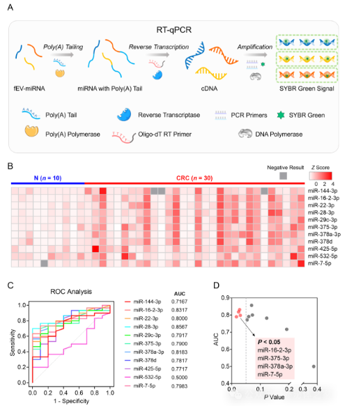 在前期工作中,团队发现fEVs上的两种膜蛋白(CD147和A33)能够作为结直肠癌诊断和预后的标志物(JEV,DOI: 10.1002/jev2.12300)。粪便与肠道有着特殊关联性,因而fEVs更加集中地携带了结直肠肿瘤的生物信息。miRNA是一类重要的小分子非编码RNA,具有转录后调控基因表达的功能,与肿瘤的发生、发展密切相关。在这项工作中,团队报道了fEVs携带的miRNA能够作为结直肠癌标志物,在诊断和预后监测中发挥作用。