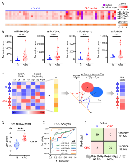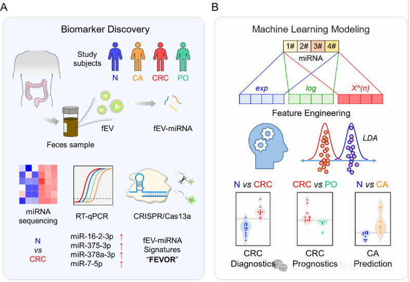 首先,作者通过miRNA测序考察正常个体和结直肠癌患者的fEV-miRNA表达谱,初步得到了候选miRNA标志物。随后,利用RT-qPCR在更多样本中对测序结果进行验证,进一步确定了4条miRNA标志物。同时,为了更加便捷地对fEV-miRNA进行检测,作者建立了基于CRISPR/Cas13a的miRNA检测平台。最后,借助特征工程和线性判别分析(LDA),分别建立针对结直肠癌诊断、预后监测和早期预警的机器学习模型。(图1)