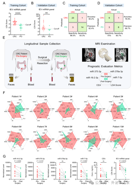 接着,收集预后(接受手术)的结直肠癌患者的粪便样本,并考察了训练集和验证集中的LDA Score指标变化。为了进一步确认LDA Score在结直肠癌预后监测中的潜力,作者开展了纵向研究,收集10例术前-术后配对的粪便样本。LDA Score在术后样本中显著下调,证明LDA Score能够对结直肠癌预后进行有效的监测。(图7)