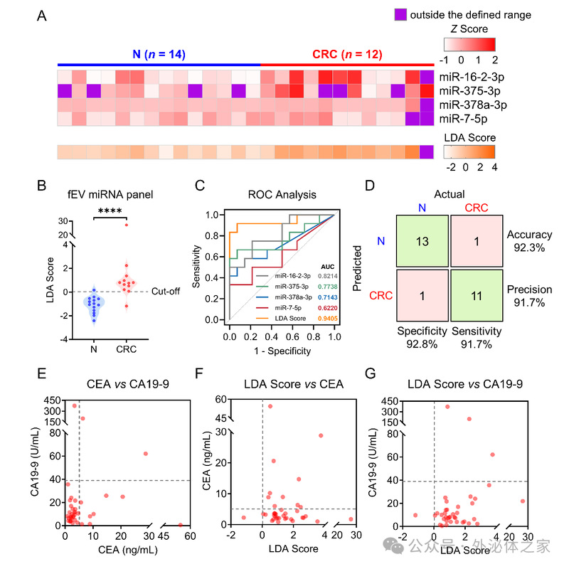 作者考察了31例正常个体和26例结直肠癌患者的miRNA标志物表达水平,采用特征工程联合LDA算法,将4条miRNA转化为复合指标LDA Score,利用训练集建立模型,并在验证集中对模型进行了验证。结果表明,结直肠癌诊断模型具有良好的AUC值(训练集0.9864,验证集0.9405)、特异性(训练集93.5%,验证集92.8%)和敏感性(训练集100%,验证集91.7%),证实了fEV-miRNA在结直肠癌诊断中的效能。随后,将LDA Score与临床常用血液指标CEA和CA19-9进行比较,在38例结直肠癌患者中,LDA Score成功诊断出37例患者,诊断灵敏度达到97.4%,诊断效果明显优于CEA(10/38,26.3%)和CA19-9(3/38,7.9%)。(图5,图6)