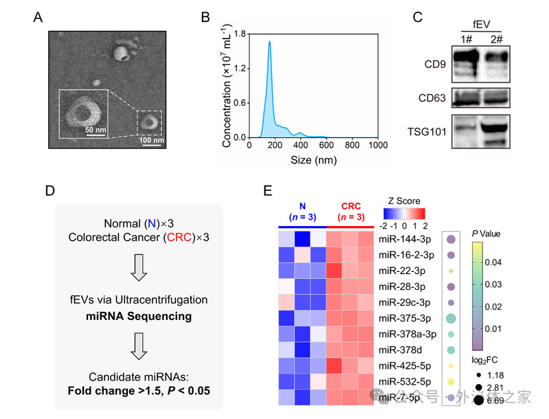 通过冷冻透射电镜(cryo-TEM)、纳米颗粒跟踪分析(NTA)和免疫蛋白印迹(Western Blot)对fEVs进行表征,结合miRNA测序结果,初步得到11条候选miRNA标志物。(图2)