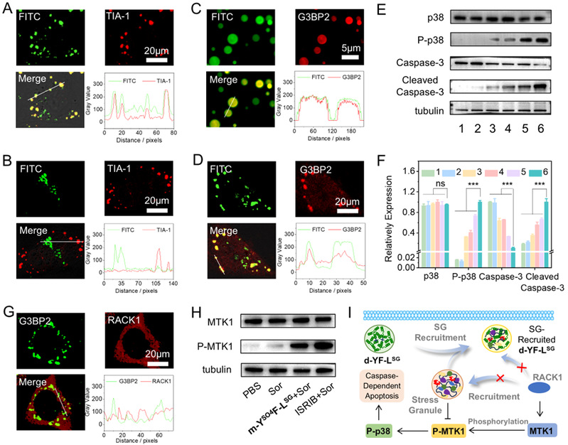 研究团队进一步对化疗增效的机制进行研究,利用共聚焦激光扫描显微镜观察到,经m-YSO4F-LSG处理并联合索拉非尼刺激的肿瘤细胞中,液滴荧光信号与另一种应激颗粒核心组分TIA-1蛋白免疫荧光信号呈现高度共定位,线扫描分析显示两者重叠度显著高于对照组。由于液滴未携带TIA-1靶向配体,这一现象直接证明液滴通过物理融合与应激颗粒结合,而非单个蛋白募集。同时,共聚焦实验结果表明液滴与应激颗粒的融合能够抑制其对RACK1蛋白的隔离。先前的研究表明,应激颗粒主要通过隔离蛋白RACK1并抑制MTK1-SAPK信号通路,从而阻止p38磷酸化和caspase-3活化,促进细胞存活。蛋白印迹实验表明,液滴与应激颗粒的特异性融合触发了MTK1蛋白的磷酸化激活,进而激活p38-MAPK信号通路级联反应,最终导致促凋亡关键因子caspase-3的剪切活化(图5)。