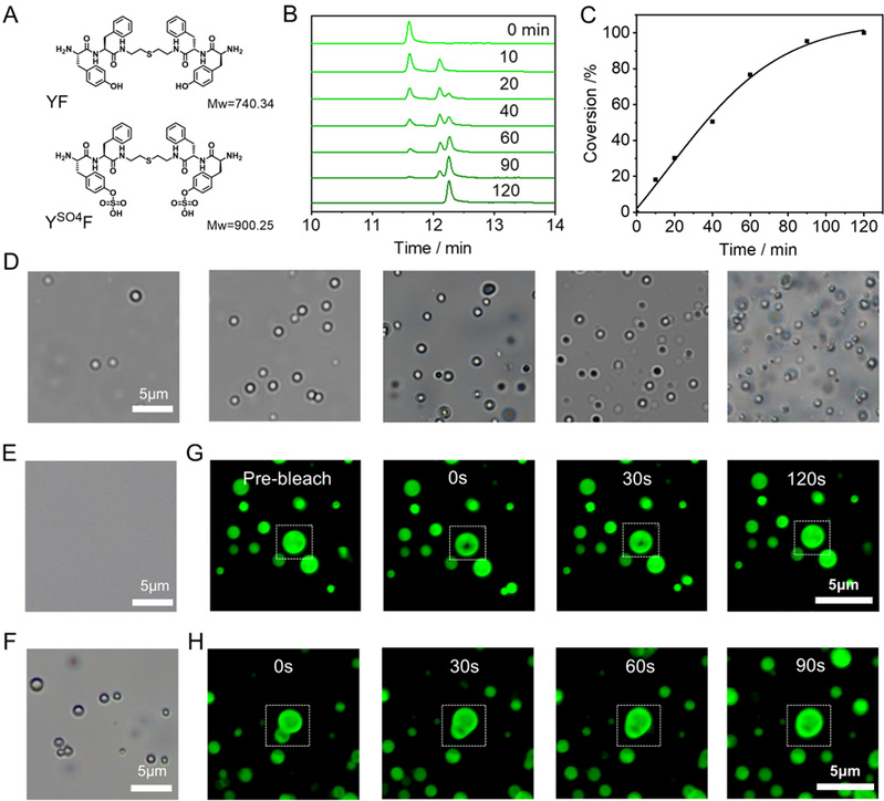 作者首先介绍了具有原位液-液相分离能力的多肽分子YSO4F的酶响应水解以及酶响应相分离能力。研究团队设计了含双硫酸化酪氨酸的多肽YSO4F,其结构遵循“粘合子-间隔子-粘合子”基序,硫酸化修饰赋予其亲水性及酶响应性。体外实验表明,YSO4F在硫酸酯酶催化下逐步脱去硫酸基团,转化为疏水性多肽YF,进而发生液-液相分离形成球形液滴。荧光漂白恢复及液滴融合实验证实,该液滴具有典型的凝聚体动态特性,半恢复时间为23.4s,表明分子在液滴与胞质间快速交换(图2)。