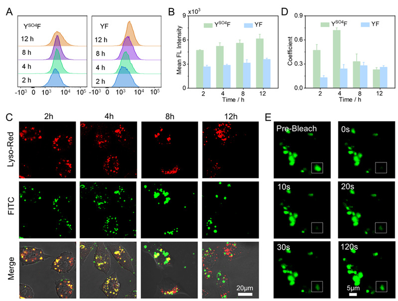 接下来研究团队对细胞内的原位相分离过程进行了进一步研究(图3),研究发现YSO4F通过网格蛋白介导的内吞作用进入细胞,定位于溶酶体后经硫酸酯酶催化去硫酸化,并通过质子海绵效应逃逸至细胞质,最终发生液-液相分离形成液滴。共聚焦激光扫描显微镜显示,胞质内形成的液滴具备典型的液-液相分离特征,其荧光漂白后恢复特性证实了液滴与周围环境中分子的快速交换能力。对照实验显示,当使用硫酸酯酶抑制剂预处理癌细胞,或在不过表达该酶的正常成纤维细胞中,均未观察到液滴形成,充分验证了酶响应是触发原位相分离的关键条件。