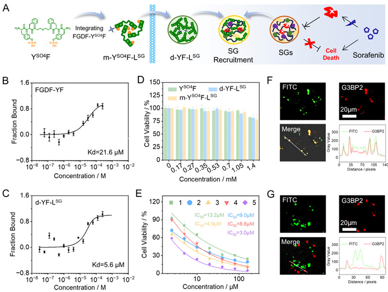 在无膜细胞器靶向研究中,研究团队通过引入能特异性结合应激颗粒核心蛋白G3BP2的配体FGDF,成功构建了m-YSO4F-LSG体系。该体系在肿瘤细胞内形成的功能性液滴(d-YF-LSG)可通过配体-蛋白识别作用,与应激颗粒发生特异性融合,实现对这一无膜细胞器的精准靶向。微量热泳动实验表明,液滴微环境使FGDF-YF与G3BP2的结合亲和力提升3.9倍,显著增强了对应激颗粒的募集效果。共聚焦激光扫描显微镜显示,含有应激颗粒靶向配体的m-YSO4F-LSG体系具有优异的应激颗粒靶向能力。当与化疗药物索拉非尼联合使用时,显著提升了化疗药物对肺癌细胞的杀伤效力,使药物半数抑制浓度大幅降低,细胞凋亡率显著升高,为克服肿瘤化疗耐药性提供了关键的作用靶点和增效策略(图4)。
