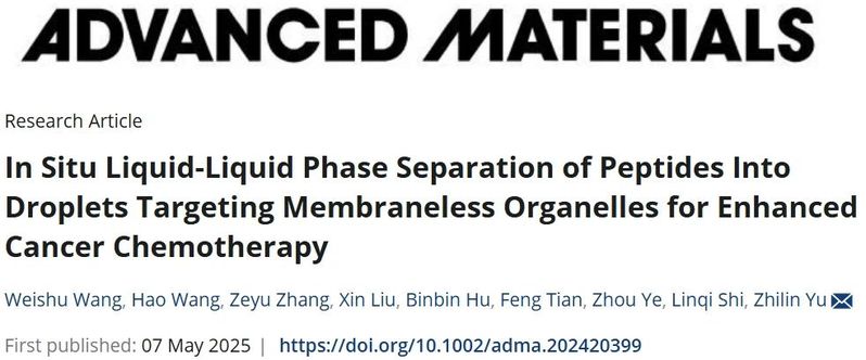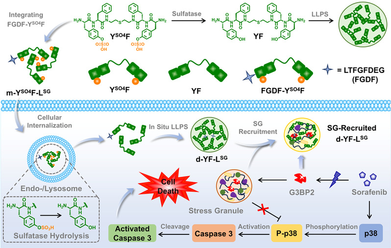 图1.活细胞内多肽原位相分离形成液滴并靶向应激颗粒,与索拉非尼联合进行癌症化疗示意图。图片来源Adv. Mater.。