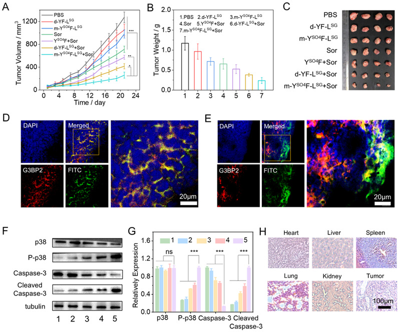 最后,在荷瘤小鼠的体内疗效验证中,研究团队采用瘤内注射m-YSO4F-LSG 联合腹腔注射索拉非尼的治疗方案,结果显示该联合疗法在21天的观察期内实现了显著肿瘤体积抑制,优于单一药物治疗组,展现出强大的协同抗肿瘤效应。免疫荧光分析进一步揭示,肿瘤组织中形成的功能性液滴与应激颗粒核心蛋白 G3BP2的共定位系数高达0.77,直接证实了液滴对应激颗粒的高效靶向能力。蛋白印迹检测显示,联合治疗组中p38磷酸化水平显著升高,同时cleaved caspase-3蛋白表达量大幅增加,明确印证了caspase-3依赖凋亡通路的激活。重要器官的苏木精和伊红(H&E)染色及血液生化分析结果表明,m-YSO4F-LSG体系具有良好的生物相容性。