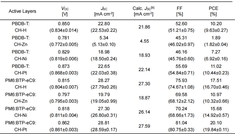 基于PBDB-T:CH-X(X=H、Zn、Ni、Pt)NFA的传统器件采用 ITO/PEDOT:PSS/PBDB-T:CH-X(X=H、Zn、Ni、Pt)/PNDIT-F3N/Ag 结构制造。具体来说,在超声波浴中依次用洗涤剂水、去离子水、丙酮和异丙醇清洗 ITO 涂层玻璃基板 15 min,然后用氮气吹干。使用前,在紫外线-臭氧中对清洗过的 ITO 基底进行 15 min的紫外线照射处理。然后,在 ITO 基底上以 4300 rpm的转速旋涂一层薄薄的PEDOT:PSS,时间为 20 s。随后 PEDOT:PSS 薄膜在 160 ℃ 的环境条件下烘烤 15 min,迅速转移到手套箱中。将二元 PBDB-T:CH-X(X=H、Zn、Ni、Pt)混合物(D:A =1:1.2)完全溶解在氯仿中,并加入 0.2% 的 1,8-二碘辛烷(DIO)作为添加剂,供体浓度为 6 mg mL-1,在室温下搅拌 6 h,然后以 2000 rpm 的转速在 PEDOT:PSS 层上旋涂 30 s。旋涂后,将混合薄膜 在 120 ℃ 下退火 10 min。将 PNDIT-F3N(溶于含 0.5% v/v 冰醋酸的甲醇中,浓度为 1 mg mL-1)层旋涂在活性层上,转速为 3000 rpm,时间为 20 s。最后,在 2×10-6 Pa 下沉积了 150 nm 的银,面积为 4 mm2,MASK面积约为 3.24 mm2。二元 PM6:CH-X 器件是按照上述流程制备的。PM6:CH-X (X=H, Zn, Ni, Pt): BTP-ec9溶液(重量比为1:0.1:1.1)在室温下搅拌 在室温下搅拌 6 h,然后以 1900 rpm的转速旋转 30 s,将 2PACZ (0.3 mg mL-1)层上。旋涂后,混合薄膜在 90 ℃ 下退火 10 min。