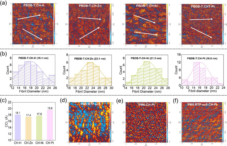 图4.(a)PBDB-T:SMA共混物的AFM-IR图像。供体和受体域分别用蓝色和红色标记。(b)图4a中相分离尺寸的统计分析。(c)面外方向D/A共混物的CCL。(d,e,f)分别为PM6:BTP-eC9、PM6:CH-Pt和PM6:BTP-eC9:CH-Pt共混物的AFM-IR图像。
