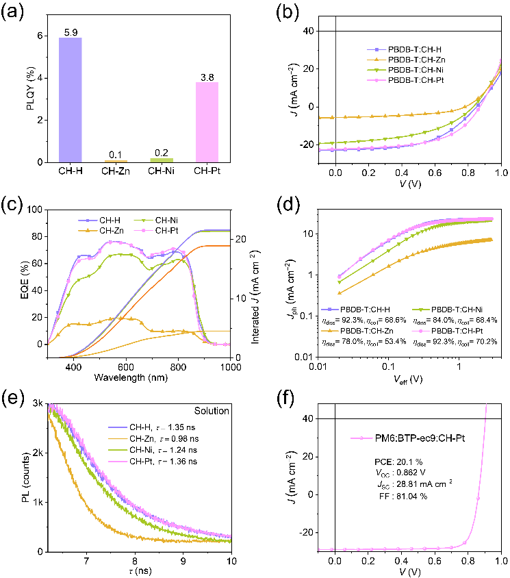 图3.(a)SMA薄膜的光致发光量子产率(PLQY)。(b)PBDT-T:SMA二元OSCs的J-V曲线。(c)二元OSCs的EQE图和积分JSC曲线。(d)Jph与Veff曲线,表明ηdiss和ηcoll。(e)SMA的时间分辨PL衰减迹线。(f)PM6:BTP-eC9:CH-Pt三元OSCs的J-V曲线。