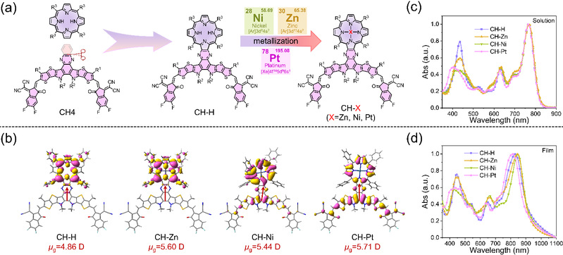 图1.(a)CH-H、CH-Zn、CH-Ni和CH-Pt的化学结构。(b)计算的HOMO分布和偶极矩。(c、d)SMAs分别在氯仿溶液和固体膜中的电子吸收。