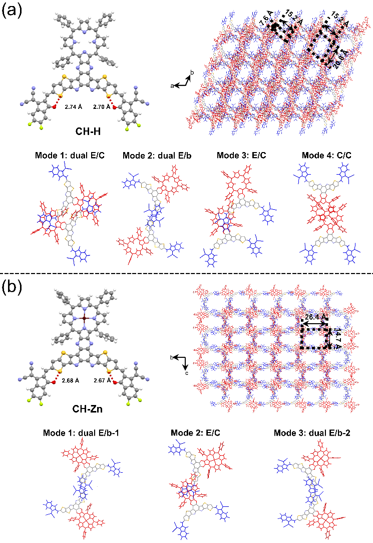 图2. 从(a)CH-H和(b)CH-Zn单晶中提取的分子几何形状、分子堆积拓扑结构和主要分子间堆积模式。请注意,如图S14所示,有一个H2O分子与锌原子配位,为了清楚起见,在此我们省略了它。