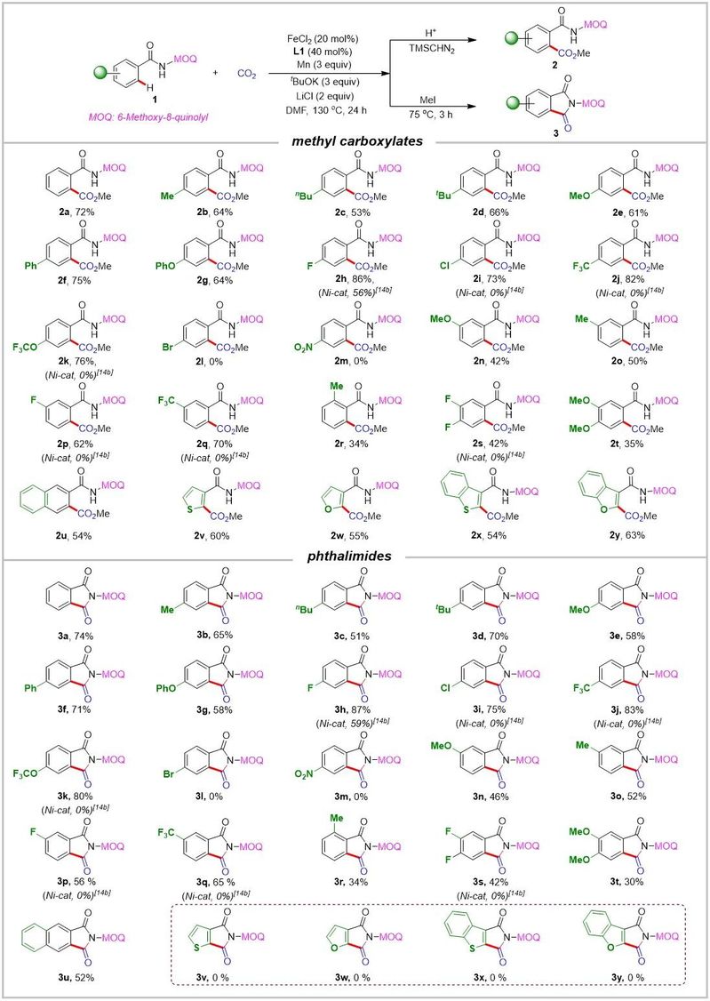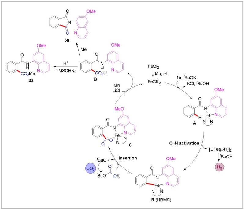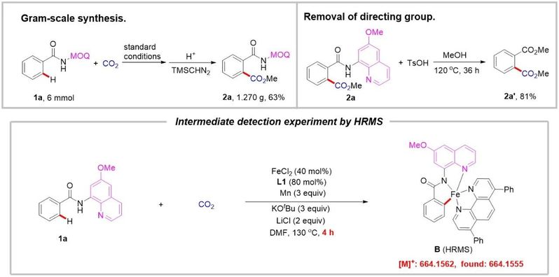 本文通过考察铁催化的N-(6-甲氧基喹啉-8-基)苯甲酰胺底物与CO2的羧化反应,通过不同的后处理方法,成功以中等至高产率得到各种芳基羧酸甲酯或邻苯二甲酰亚胺。该反应展现出优异的底物普适性。与以前报道的镍催化体系相比,镍催化体系不兼容的缺电子底物在该反应体系中也具有很好的兼容性。克级实验验证了其合成实用性。通过在甲醇中使用TsOH处理很容易地除去底物的导向基团,以高产率得到邻苯二甲酸二甲酯。作者通过对反应瓶中气体进行气相色谱分析,检测到H2作为副产物。动力学同位素效应实验结果表明决速步可能涉及C-H键断裂。通过HRMS从反应混合物中检测到可能的Fe(II)-络合物中间体,支持了它作为催化循环中的潜在关键中间体。作者也通过电子顺磁共振(EPR)实验,确定了该反应的活性铁催化剂的氧化态为Fe(I)。在此基础上,作者提出了可能的催化反应机理。