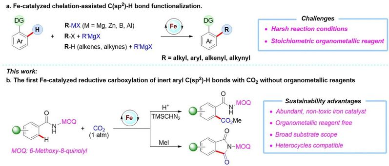 二氧化碳是主要的温室气体。但因其资源丰富、无毒、可再生和低成本,二氧化碳是合成高附加值化学品的理想C1来源。然而,CO2的热力学稳定性和动力学惰性导致其化学转化没有得到广泛开发。在过去的几十年里,通过过渡金属催化的C−H键与CO2的羧化反应取得了较大进展,但涉及惰性C(sp2)−H键的直接羧化反应报道很少,且主要集中在贵金属铑和钯催化的反应。在此,我们报道了首例铁催化的使用Mn作为还原剂的惰性芳基C−H键与CO2的还原羧化反应。该转化避免了使用对空气和水汽敏感的金属有机试剂,具有广泛的底物范围。