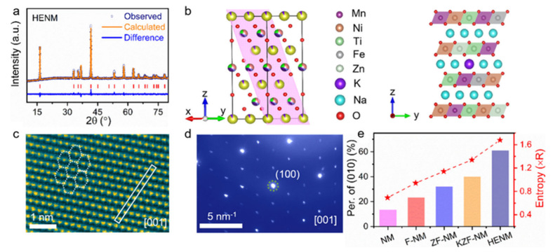 通过对材料的晶体结构进行详细表征,发现HENM中过渡金属层与氧原子之间的键合强度显著增强。这一现象主要归因于熵调控策略对电子云密度的优化,导致TMO₂层间距收缩,同时钠层间距扩张。具体而言,X射线衍射(XRD)分析表明,所有布拉格反射均与菱形晶格的R3̅m对称性一致。Rietveld精修结果进一步确认了HENM的高结晶度且无杂质存在,而对照材料NM则含有少量NiO(6.3 wt%)。这表明高熵特性有助于形成固溶体结构。扫描透射电子显微镜(STEM)结合高角度环形暗场(HAADF)和环形亮场(ABF)成像技术揭示了HENM在原子尺度上的晶体结构。STEM-HAADF图像显示,TM-TM距离为2.99 Å,相邻TMO₂层的间距为5.35 Å,与(003)晶面的晶格间距一致。此外,选区电子衍射(SAED)图像表明其高结晶度,能量色散光谱(EDS)映射显示所有元素均匀分布。SEM图像显示,HENM颗粒厚度为1-2 μm,明显厚于NM颗粒(约200 nm),这种厚度差异与配置熵相关,并表明HENM具有更多的Na⁺传输通道和存储空间。