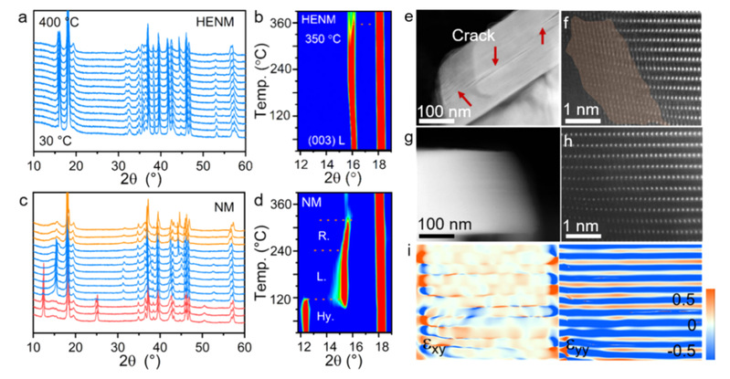 原位高温XRD和差示扫描量热法(DSC)分析显示,HENM在高达350°C时仍保持稳定的晶体结构,而对照材料NM则经历了多阶段相变,包括水化相、岩盐相以及层状结构坍塌。这表明HENM具有更高的热耐受性和更低的放热峰焓值。在空气稳定性方面,HENM暴露于空气中未出现明显的副产物生成,而对照材料则迅速吸湿并与二氧化碳反应生成碳酸钠等副产物,导致结构劣化。SEM和EDS分析进一步证实,HENM颗粒表面光滑无残留,元素分布均匀,显示出优异的化学稳定性。几何相位分析(GPA)表明,NM在循环后表现出大量位错和高局部/界面应变,而HENM几乎无缺陷和应变,这归因于高熵调控抑制了晶格变形和裂纹生成。
