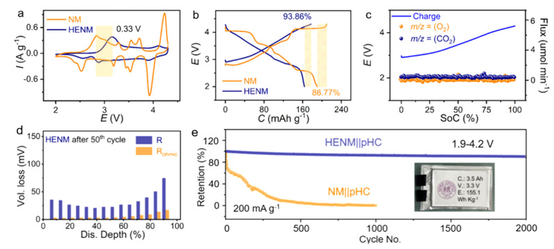 电化学测试显示,基于Ni²⁺/Ni³⁺和Fe³⁺/Fe⁴⁺的氧化还原反应,HENM在2.0-4.3 V的电压范围内实现了160.2 mAh/g的比容量,。组装的软包电池在4.2 V高电压下达到了155.1 Wh/kg的能量密度,并在2000次循环后仍保留了88%的初始容量。GITT测试表明,HENM的钠离子扩散系数较对照材料高出一个数量级,进一步验证了其快速的动力学特性。此外,HENM的平均放电过电势在50次循环后仅为0.025 ± 0.005 V,远低于NM的0.106 ± 0.012 V。这些结果表明,熵调控不仅提高了材料的离子传输速率,还显著降低了界面阻抗,从而增强了电池的倍率性能和循环寿命。