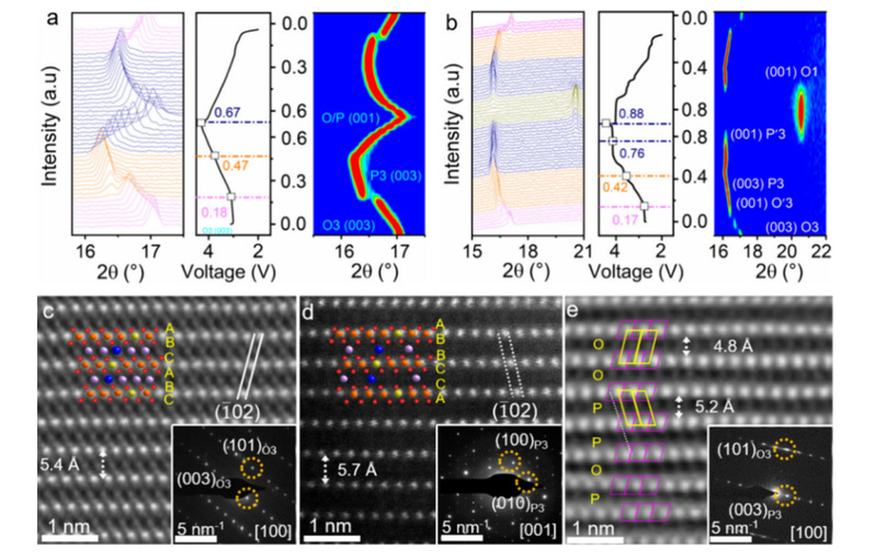 随着可持续交通和大规模储能需求的快速增长,钠离子电池(SIBs)因其资源丰富、成本低廉等优势成为研究热点。层状过渡金属氧化物(TMOs)正极材料因其高能量密度和易于制备的特点备受关注。然而,在高电压下进行Na+脱嵌时,层状氧化物通常会经历复杂的相变过程,导致严重的各向异性晶格应变和应力积累。这种不可逆的相变不仅会引起晶体结构的疲劳和不稳定性,还会引发微裂纹的产生,进一步加剧电解液分解和界面不稳定,最终导致电池性能的快速衰减甚至热失控。因此,如何调控层状氧化物在高电压下的相变行为和局部应变,成为了实现高性能钠离子电池的关键科学问题。O3型NaNi0.5Mn0.5O2被视为一种极具潜力的正极材料,其理论比容量高达240 mAh/g。然而,实际应用中,该材料在4.0 V充电时仅能释放约120 mAh/g的容量,为了提高其比容量,研究人员尝试将工作电压提升至4.2 V以上。然而,高电压下不可避免地会诱导O1相堆垛缺陷的形成,伴随显著的体积收缩和结构失稳,开发新型策略以调控高电压下的相变行为并提升材料的结构稳定性,成为当前亟待解决的重要课题。